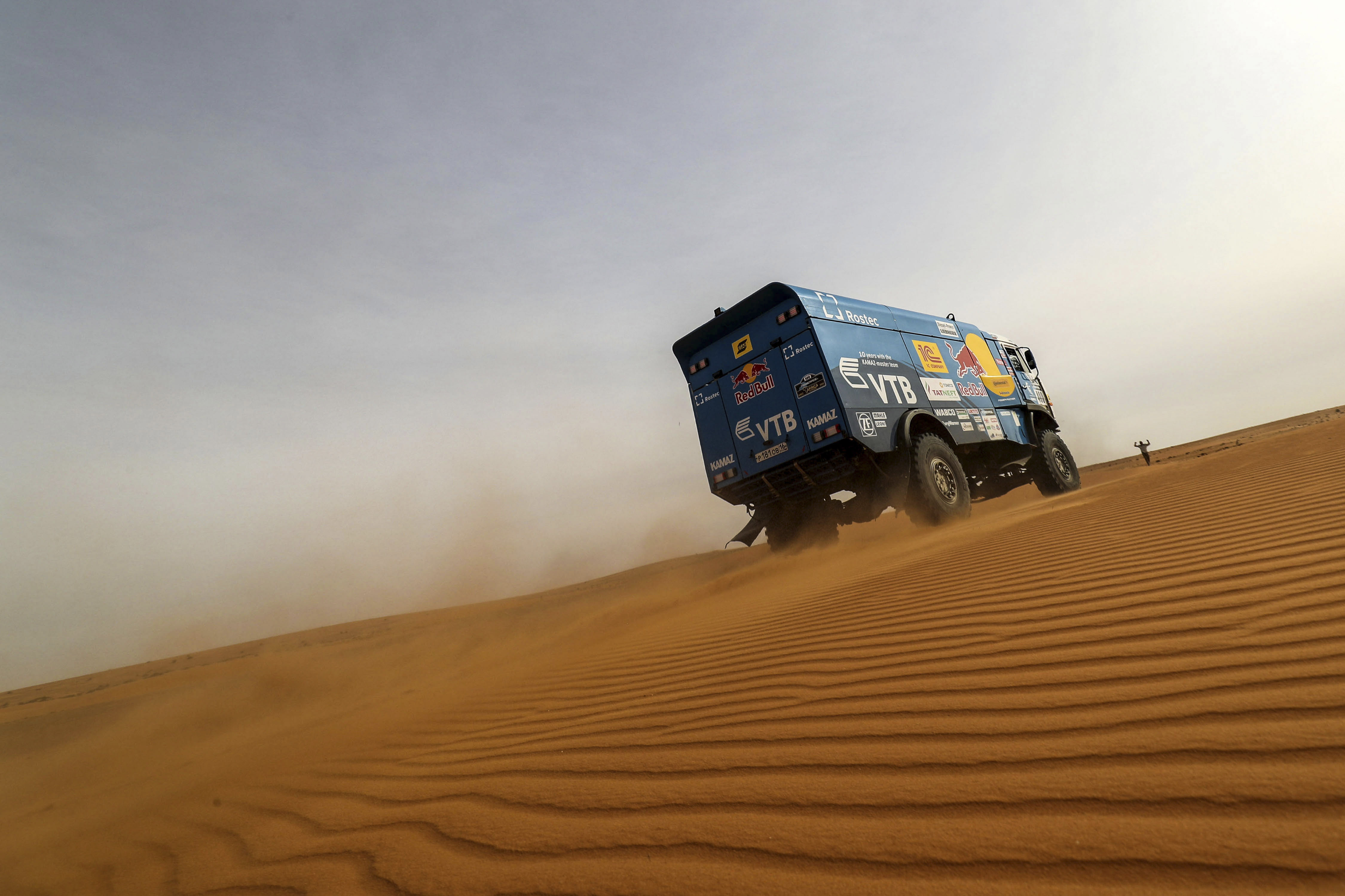 Сегодня спортсменам предстояло преодолеть целую гряду дюн. Два экипажа "КАМАЗ-мастер", выступающие на Africa Eco Race, решили пройти этот участок страхуя друг друга. По словам пилота "КАМАЗ-мастер" Андрея Каргинова, в данной ситуации эта тактика является самой верной.