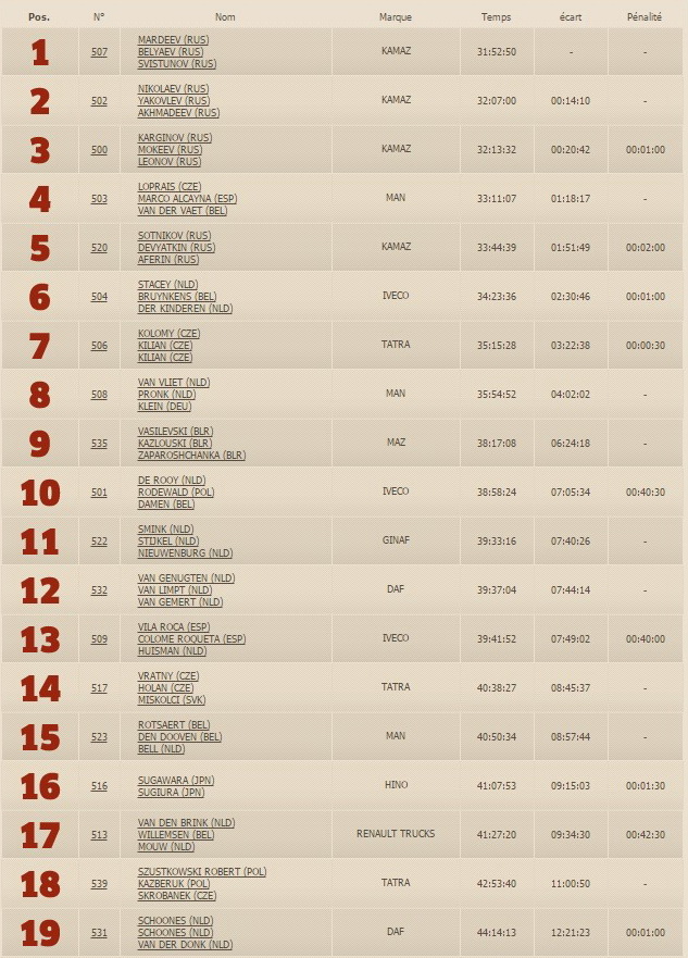 Экипажу 507, ведомому Айратом Мардеевым удалось сегодня избежать проблем с навигацией: «Доехал на двух пробитых колесах. Причем одно пробили практически со старта, на 98 километре. Вначале нас ждали пески. Дюны в районе Икике, все те же, что и в предыдущие дни. Сейчас они накатанные, а до этого довольно трудно было по ним ехать. Особенно тем, кто ехал впереди когда нужно искать оптимальные пути проезда. Тем более на ярком солнце не видно хорошо их рельефа. Затем началась зона пыли – фэш-фэш, каменистые участки, русла рек. В кабине очень пыльно. На первом же прямике обозначенном двумя знаками опасности догнали Лопрайса. Спасибо, что нисколько не задерживал, сразу пропустил. Затем увидели стоящего меняющего колеса Андрея Каргинова. Впереди показался Де Рой. Начали накатывать. По бездорожью мы его догоняем, но как только начинается извилистая твердая дорога по типу классического ралли там он уезжает вперед. Во-первых за счет того что перед ним чистое пространство, а мы едем за ним в его пыли. Во-вторых, надо признать на рулежной быстрой дороге он едет классно. На двузначном бездорожье мы его опять догнали и объехали уже когда встретили экипаж Эдуарда Николаева сбившегося с курса. Жерар попытался оторваться. Я «зацепился» за его крышу и за его фонари в пыли. Это самое важное: если ты успел подъехать в пыли, увидел его крышу и фонари надо зубами за него держаться. Ориентируешься по прыгающему кузову и вспыхивающим периодически тормозам. Чуть отстанешь - ориентиры исчезнут, и ты остаёшься вслепую».
