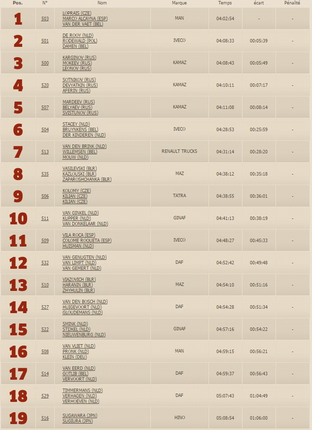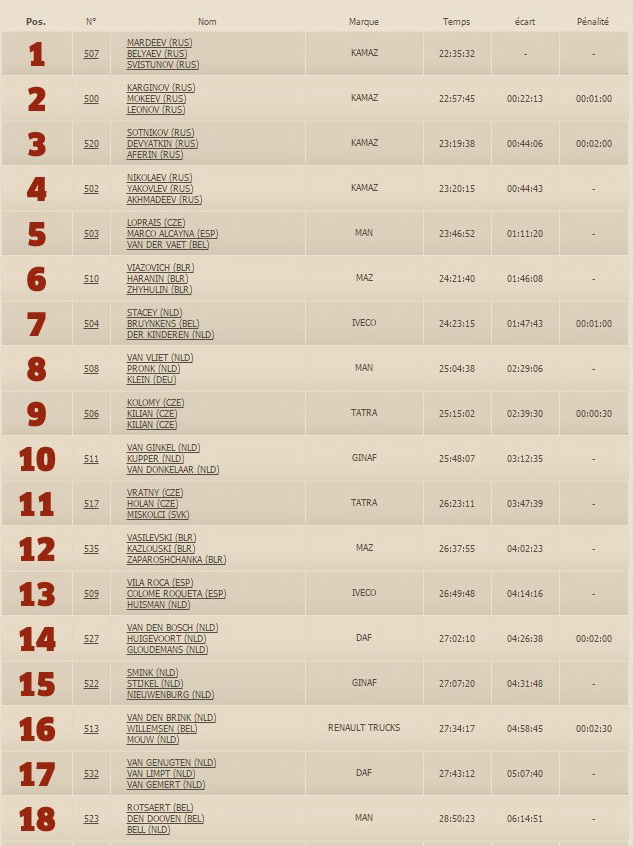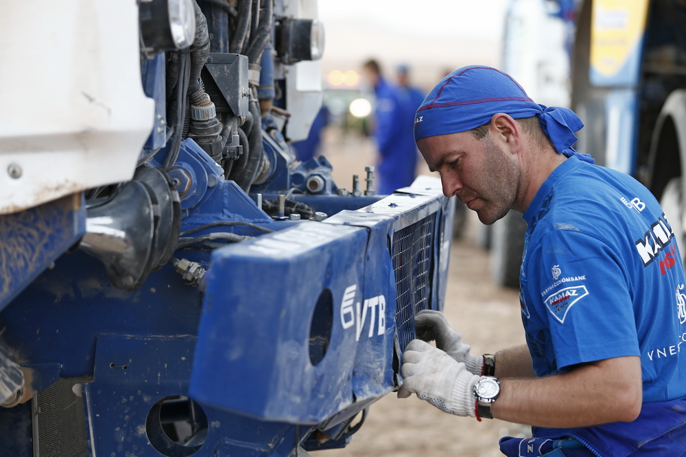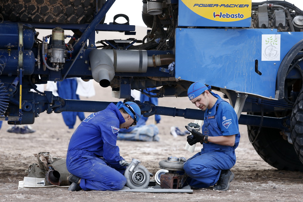 Участников грузовой категории на их 335-километровом марафонском этапе ждал маршрут спецучастка разработанный специально для них. Конечно, кто есть кто должны были продемонстрировать на этапе пилоты. Но вот на долгожданном бивуаке, ключевыми игроками марафонского этапа должны были стать бортовые механики. Впрочем, кое-кому приступить к своим прямым обязанностям пришлось уже на этапе. Экипаж Эдуарда Николаева до сегодняшнего дня возглавлявший таблицу генеральной классификации, потерял более часа из-за поломки турбокомпрессора. Учитывая, что температура его в рабочем состоянии около700 градусов, то такую скорость замены можно считать своеобразным рекордом. Но вряд ли это может подсластить ситуацию. Слабым утешением наверно может служить, что сегодня многие теряли время. Например, Ханс Стейси и Мартин Коломы потеряли сегодня по полчаса.