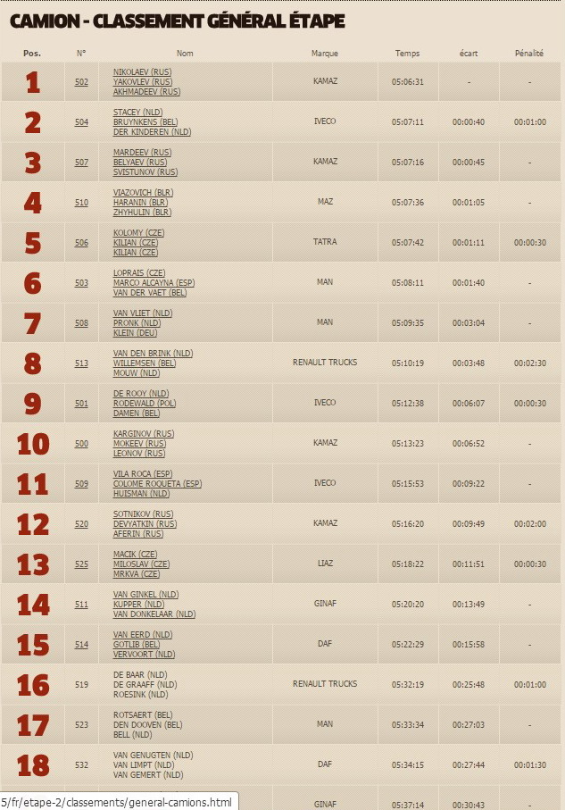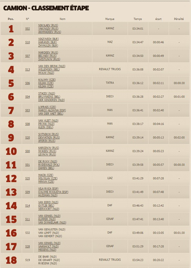 Айрат Мардеев сегодня третий (03:34:50). Дмитрий Сотников – девятый! Посеянный в начале гонки под 520-м номером самый молодой камазовец после сегодняшнего этапа резко продвинулся вверх в генеральной классификации, неплохо улучшив свои стартовые позиции на следующие этапы. Дмитрий был на этапе даже быстрее Андрея Каргинова (10 место, 03:39:24) и Жерара Де Роя (11 место, 03:39:28).