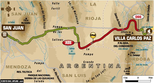 45 градусов жары в Сан Хуане, втором по счету бивуаке ралли Дакар-2015, пожалуй слишком тяжелое испытание, как для участников, организаторов, так и журналистов сопровождающих гонку. Первые горные участки, проложенные на высотах около 2000 метров, каменистые покрытия только усугубили трудности сегодняшнего 331-километрового скоростного участка Вила-Карлос-Пас – Сан Хуан. Большую часть СУ составил длинный более 100 километров спуск на котором сильно грелись тормоза. Это было опасно, так как трасса изобиловала резкими поворотами с открывающимися взору экипажей пропастями и ущельями.