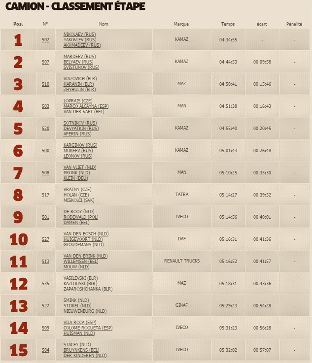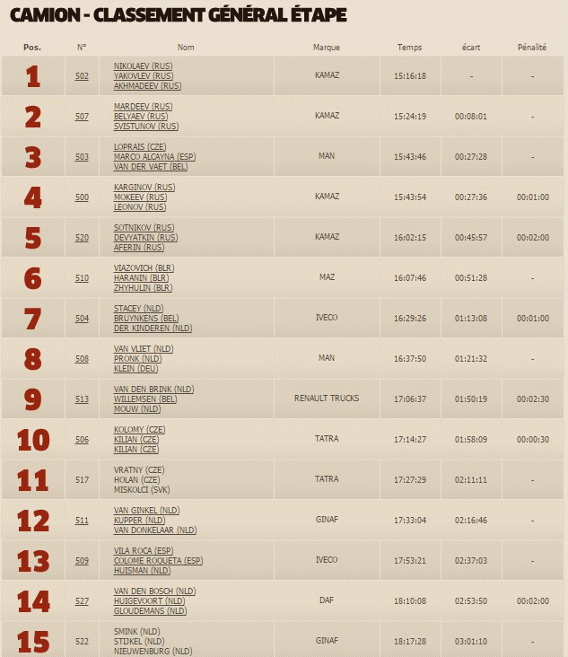Вместе с итогами сегодняшнего этапа прояснилась и ситуация со вчерашним эпизодом Жерара Де Роя: судьи присудили ему за предыдущий СУ штраф в 40 минут, а общее его отставание от лидера зачета Эдуарда Николаева (15 час 16 мин 18 сек) в генеральной классификации с учетом позднего финиша накануне составило 7 часов 23 минуты. Второй в общем зачете – Айрат Мардеев (+08:01 мин). За третье место теперь развернется борьба между Алешом Лопрайсом (+27:28 мин) и Андреем Каргиновым (+27:36 мин). На пятой позиции – камазовец Дмитрий Сотников (+45:57 мин), но расслабится ему в ближайшее время не даст быстрый белорус на МАЗе Сергей Вязович (+51:28 мин).