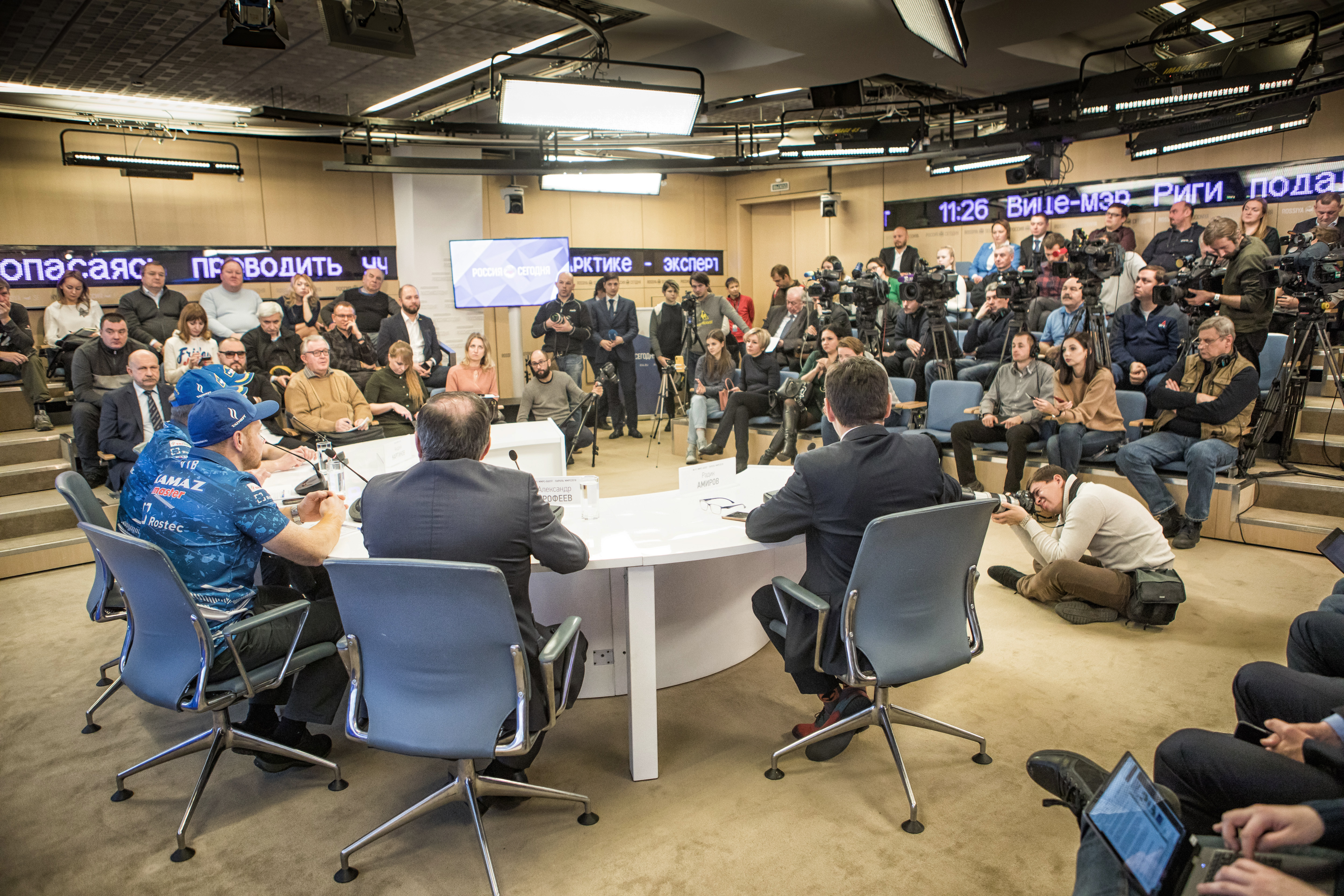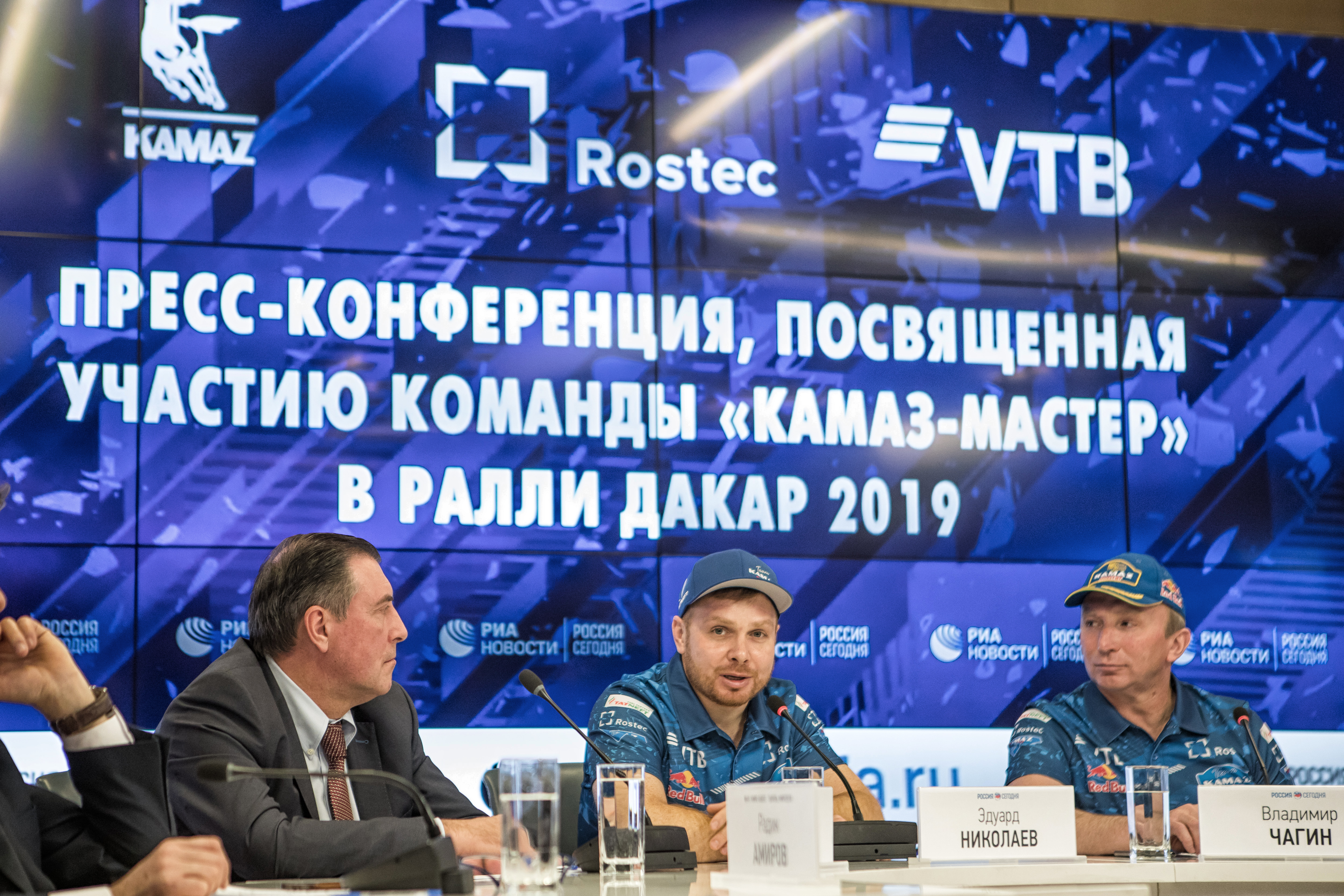 17 декабря в Москве в агентстве МИА «Россия сегодня» состоялась пресс-конференция команды «КАМАЗ-мастер», посвященная участию в ралли «Дакар-2019». В ней приняли участие руководитель команды Владимир Чагин, пилоты команды Эдуард Николаев и Андрей Каргинов, а также заместитель начальника Управления-вице президент Банка ВТБ Александр Ерофеев.