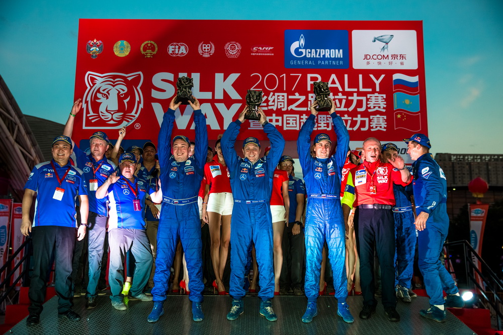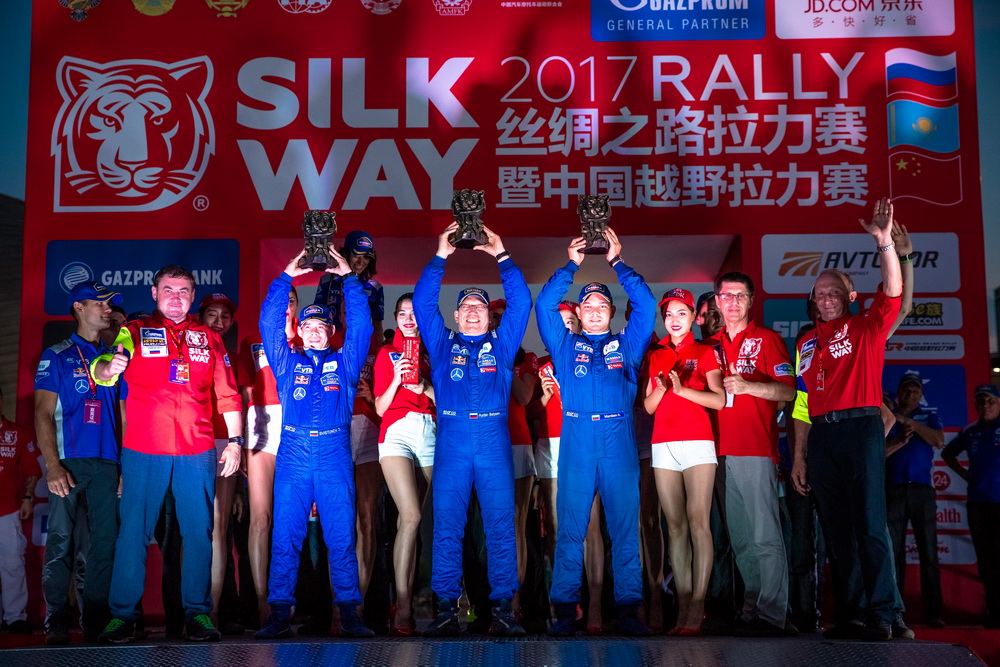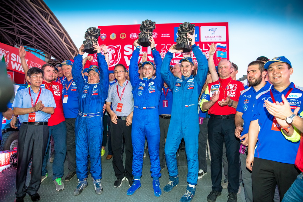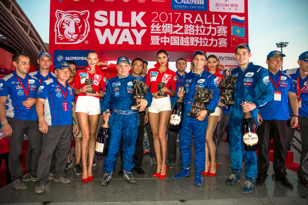 Спортсмены преодолели 14-ый этап ралли «Шелковый путь». Спортивная часть этого этапа накануне была отменена организаторами из-за проливных дождей, но в любом случае надо было уложиться в определенный временной норматив и отметиться на финише гонки. После двухнедельного испытания дюнами, проливными дождями, бездорожьем этот отрезок пути не составил большого труда и всех, бросивших вызов одному из сложнейших ралли в мире, ждал торжественный подиум.