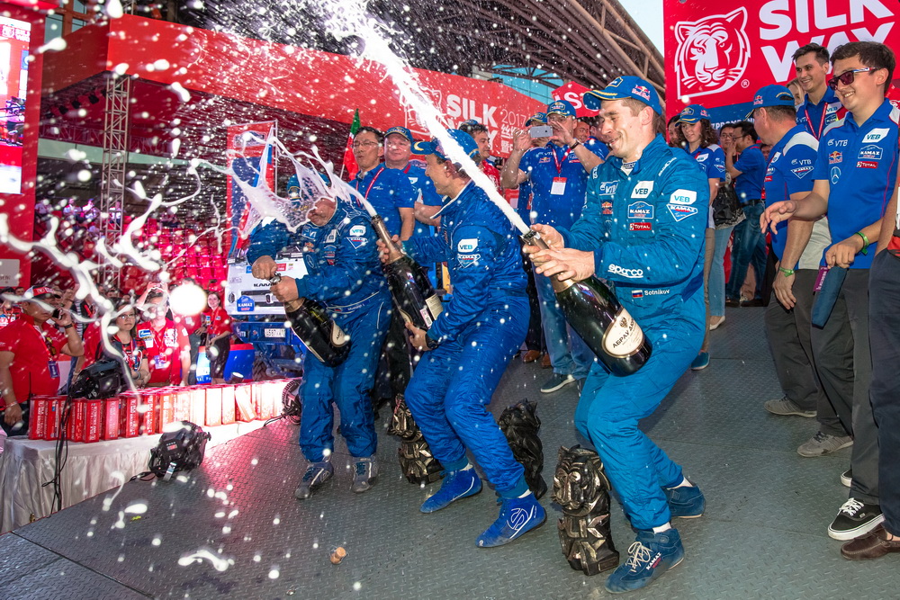 Команда «КАМАЗ-мастер» сегодня празднует победу! Все три призовых места завоевала «Синяя армада». Эта победа еще значительней для команды, учитывая, что все сильнейшие соперники в категории грузовиков приехали на гонку в полном составе. К сожалению, не всем из них удалось добраться до подиума. Команде «Рено» полным составом пришлось покинуть соревнования из-за схода всех трех экипажей, которые боролись за победу. Жерар де Рой и Мартин Коломы получили по сто часов пенализации за сход с трассы, но, тем не менее, им удалось добраться до подиума.