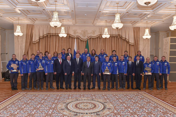 Президент Татарстана подчеркнул, что не только татарстанцы и камазовцы, но и вся Россия болели за команду. «Все мои знакомые вас поздравляют и гордятся вашими успехами», – обратился он к собравшимся.
