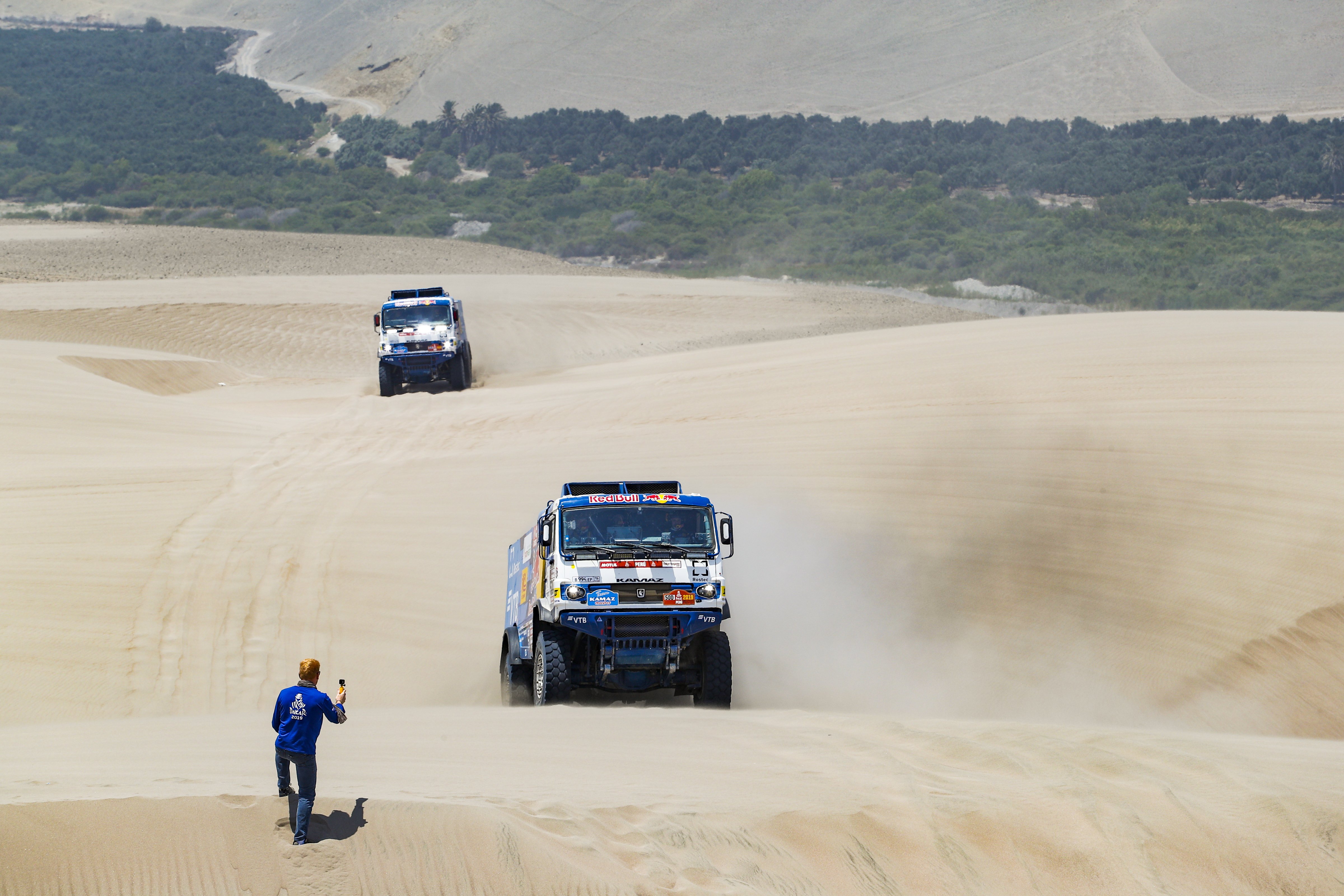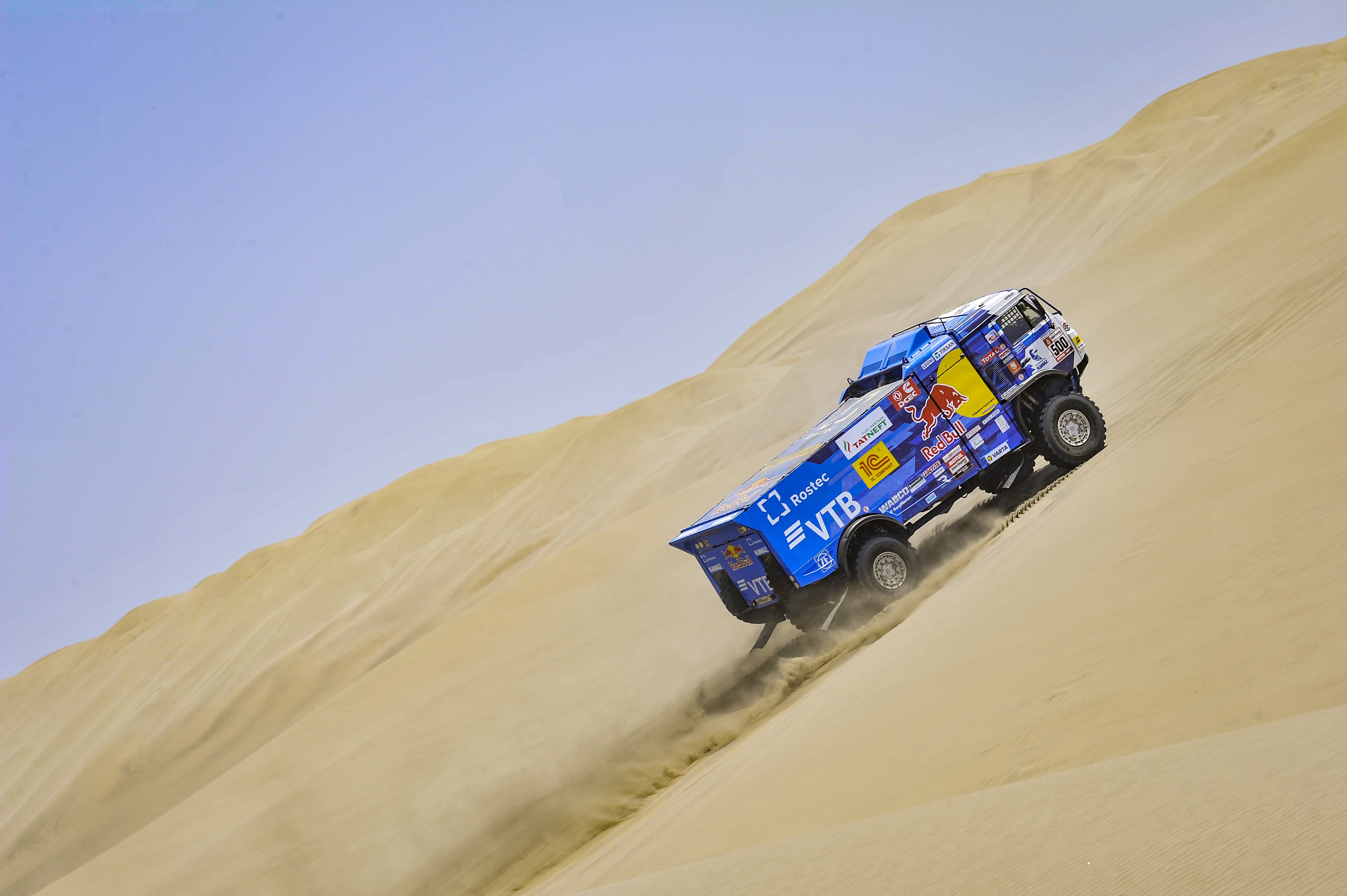 Спортивная трасса трижды пересекала сегодня знаменитое Панамериканское шоссе по которому к бивуаку в Сан Хуан Де Маркону двигались команды ассистанс. В таких точках было разрешено организовать точки сервиса, которые, к счастью, сегодня не пригодились оставшимся в гонке двум экипажам команды «КАМАЗ-мастер». Сразу после старта участников ожидала 57-километровая петля через непростой дюнный участок. Первым на него ушел экипаж Тона Генугтена команды IVECO. Дело в том, что организаторы вернули ему 15 минут времени потраченного в ходе предыдущего 5-го этапа на оказание помощи экипажу голландца Ван Кастерена (Renault). Обычно это делается, когда речь идет об угрозе жизни и здоровью пострадавшего экипажа. Трудно судить был ли случай с Генугтеном из этого разряда, судя по фотографиям Renault просто увяз правой стороной в глубокой канаве. Тем не менее, эти возвращенные 15 минут постфактум сделали голландца победителем позавчерашнего этапа и он стартовал первым.