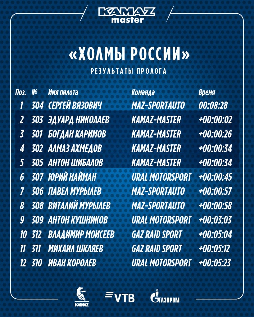Отметим, что заявленный на «Холмы России» незадолго до гонки Антон Шибалов показал пятый результат. Как рассказал опытный пилот, пока он привыкает к новому для себя составу экипажа в лице штурмана Сергея Кренева и механика Ильгиза Ахметзянова. А Дмитрий Сотников, чье участие в гонке было запланировано изначально, остался в Набережных Челнах по очень важным семейным делам, о которых мы обязательно расскажем позднее.