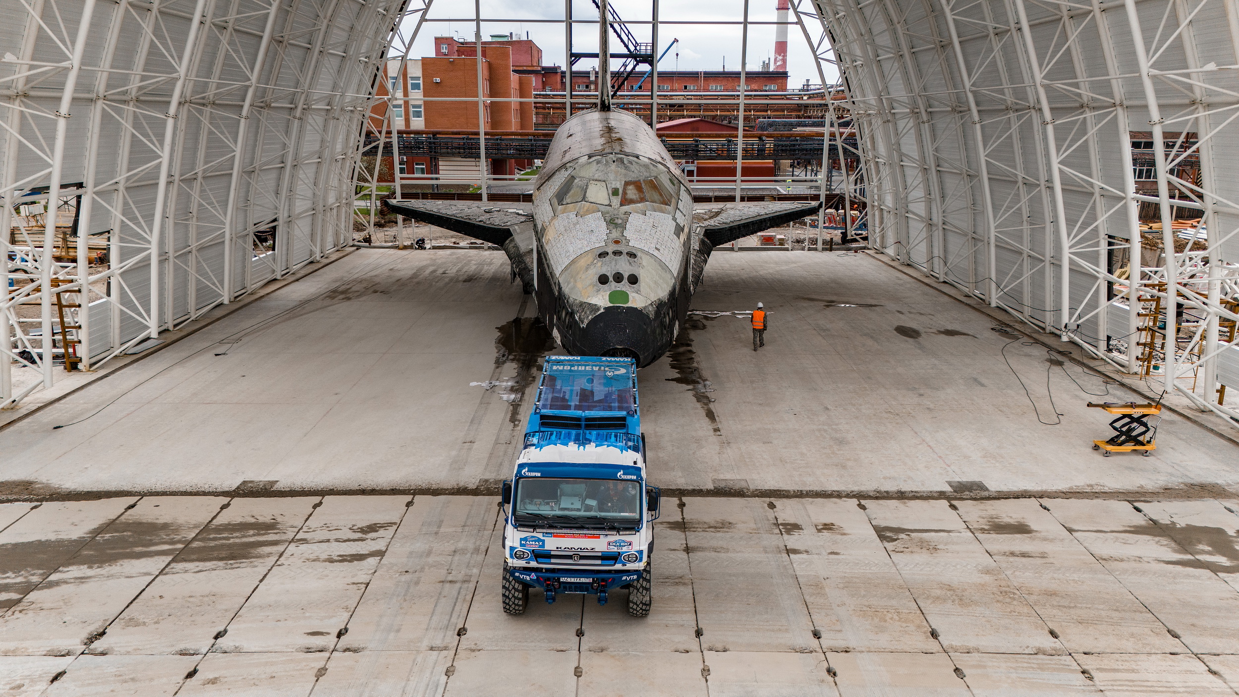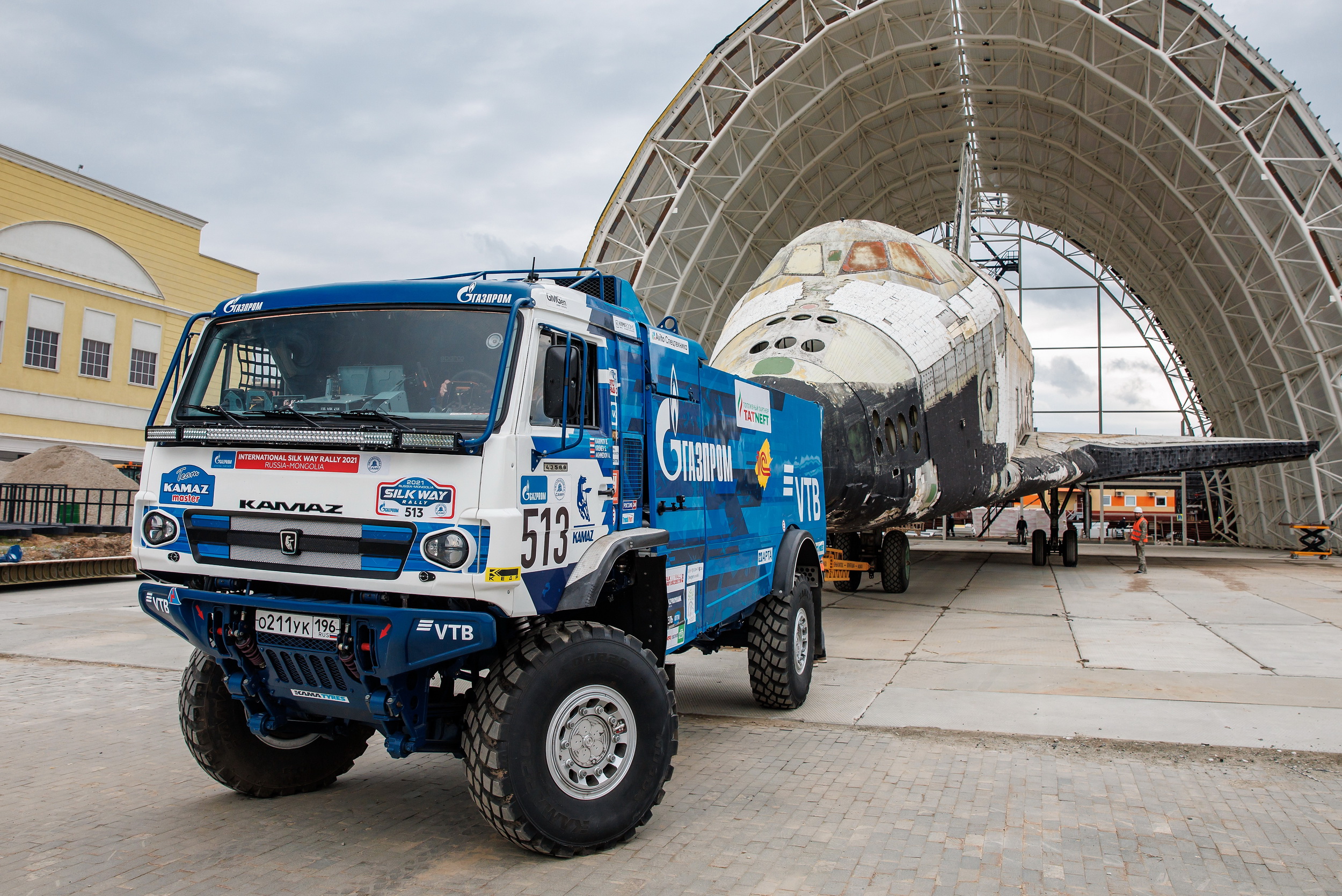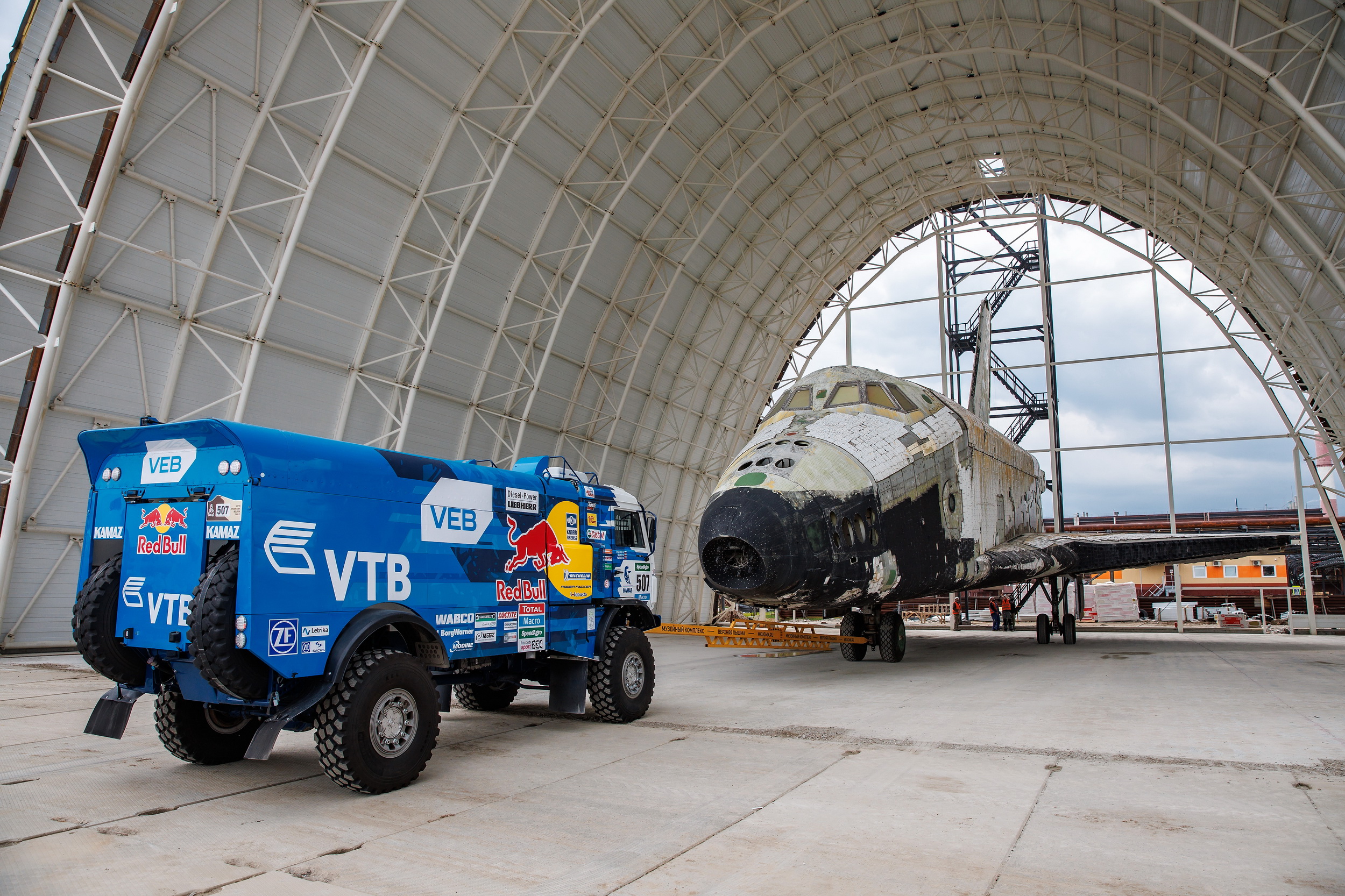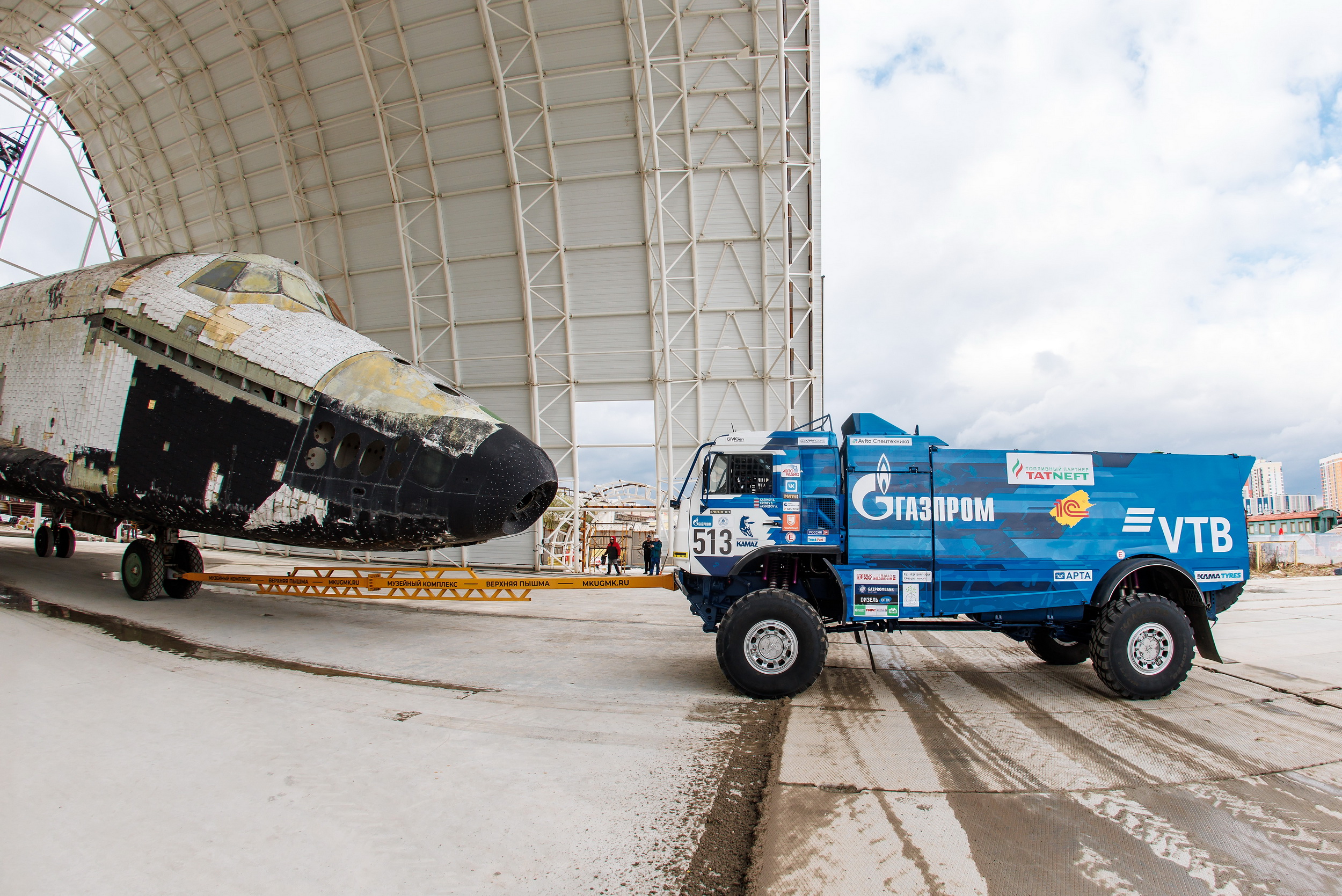 20 мая команда «КАМАЗ-мастер» приняла участие в уникальном по задумке и по сложности воплощения мероприятии. Легендарный космический корабль «Буран» при помощи спортивного «КАМАЗа» был установлен в специальный строящийся павильон Музейного комплекса гражданской и военной техники Верхней Пышмы. И «Буран», и «КАМАЗ» с недавних пор являются экспонатами этого знаменитого музея, представляющего собой одну из самых больших коллекций в мире. Она насчитывает более 15000 экспонатов, в том числе порядка 2000 единиц гражданской и военной техники. Музей основан в 2005 году.
