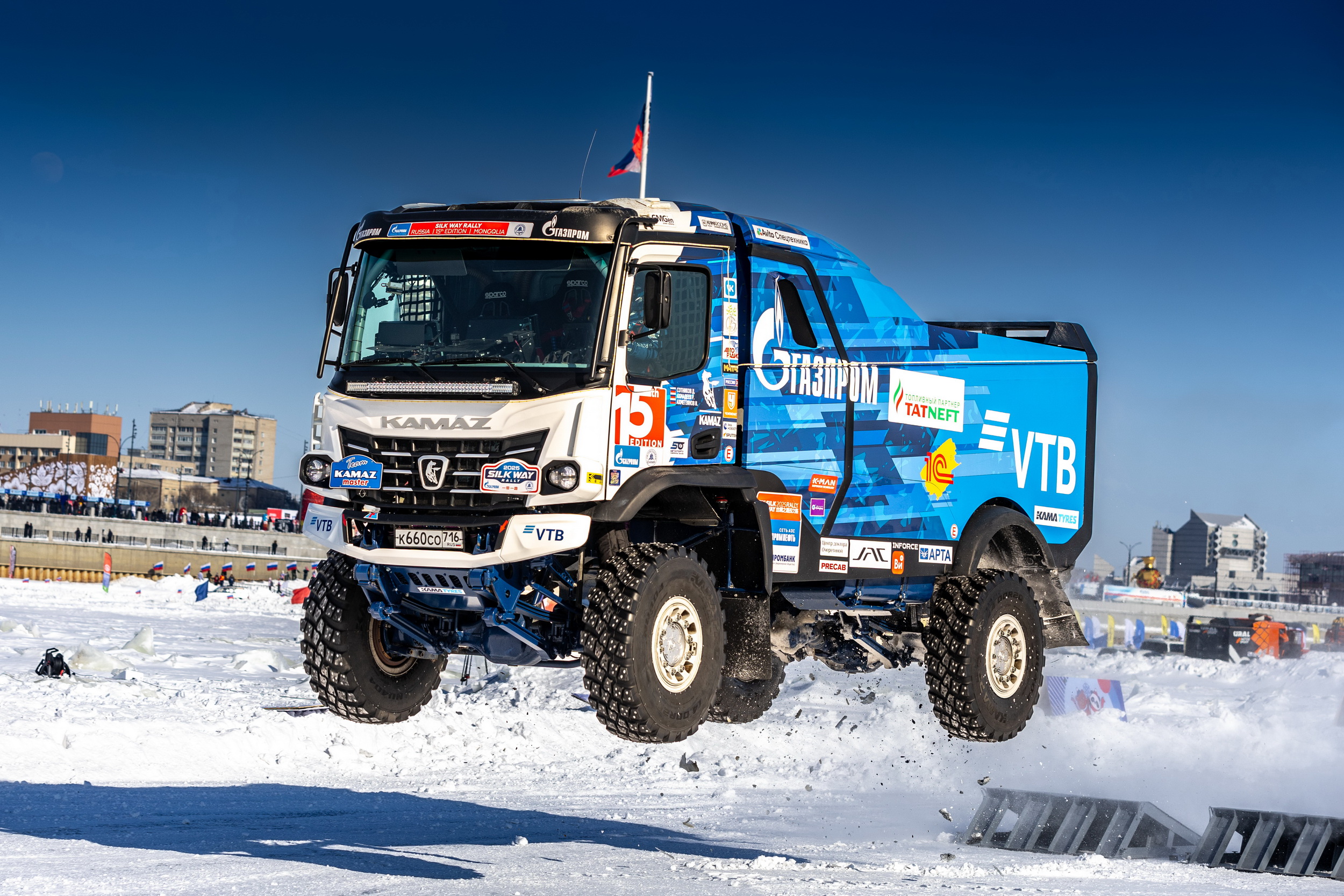 Спортивная составляющая для команды «КАМАЗ-мастер» с каждым годом становится интереснее - более сложная и профессионально подготовленная трасса, которая дает возможность оттачивать свои профессиональные навыки на льду, в условиях, отличных от тех, к которым привыкла команда. Парный дрифт на льду Амура продемонстрировали руководитель команды «КАМАЗ-мастер», пятикратный победитель ралли «Дакар» Эдуард Николаев и молодой пилот, мастер спорта Алмаз Ахмедов.