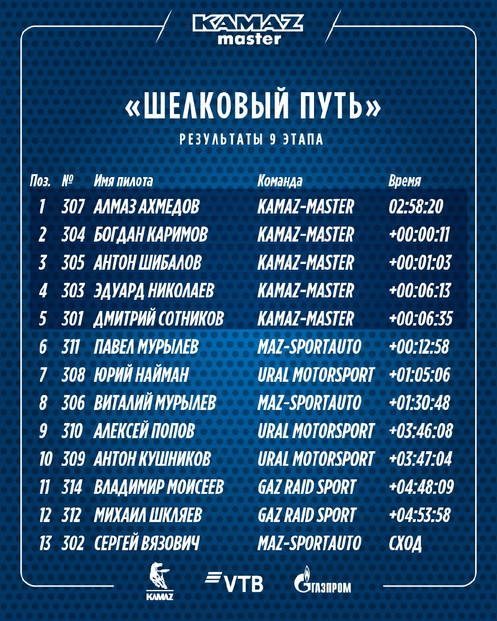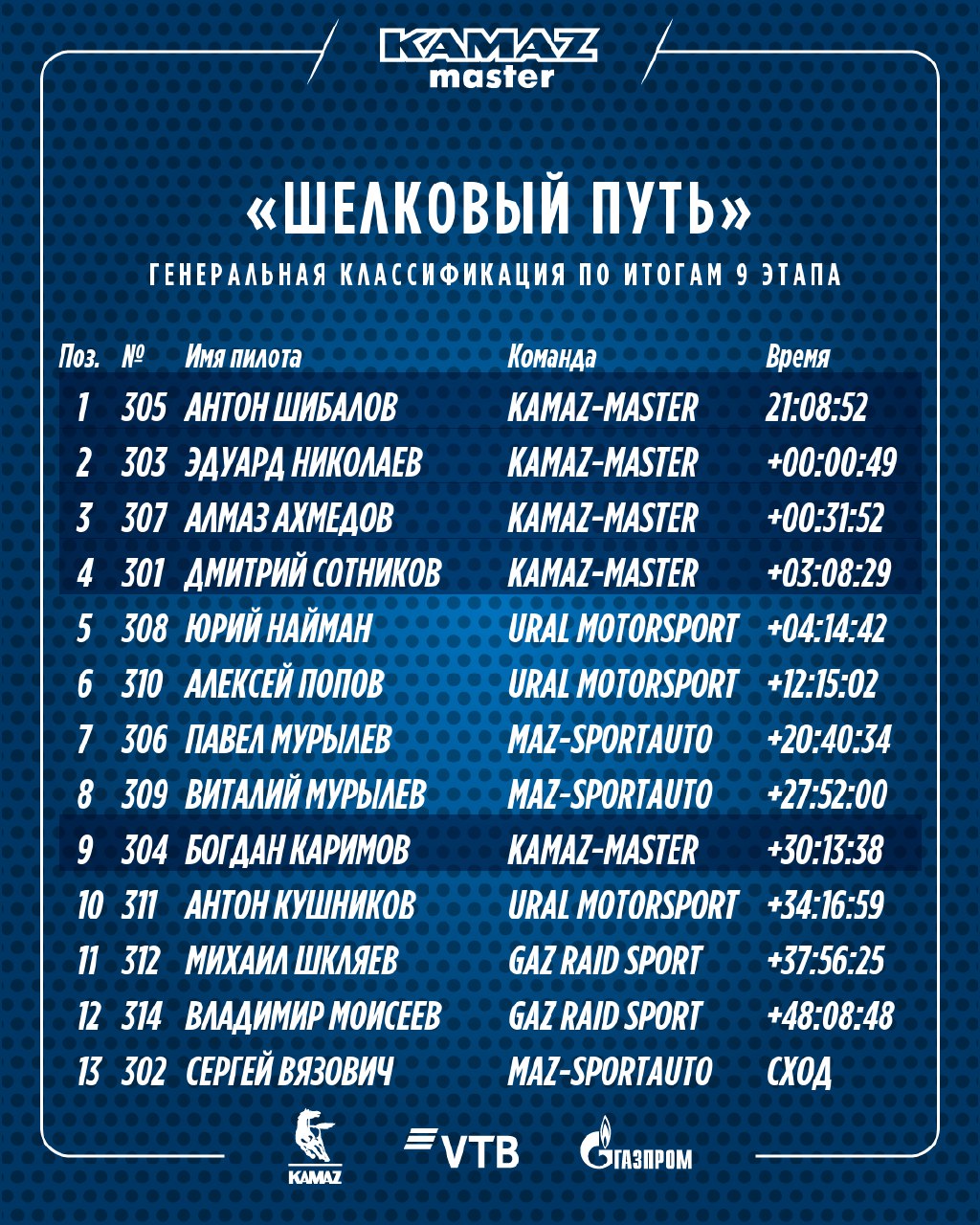 Правда под занавес дня таблица генеральной классификации грузового зачете претерпела некоторые изменения. Экипаж Эдуарда Николаева на лиазоне девятого этапа получил 5 минут 40 секунд штрафа за превышение скорости и уступил первую позицию Антону Шибалову. За два этапа до окончания гонки двух лидеров разделяют 49 секунд, тогда как идущий третьим Алмаз Ахмедов проигрывает более получаса. Следом в генеральной классификации расположились Дмитрий Сотников и Юрий Найман из Ural Motorsport.