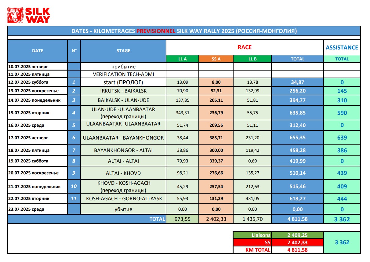 12—22 июля — 11 этапов ралли, включая марафонский, по России и Монголии;