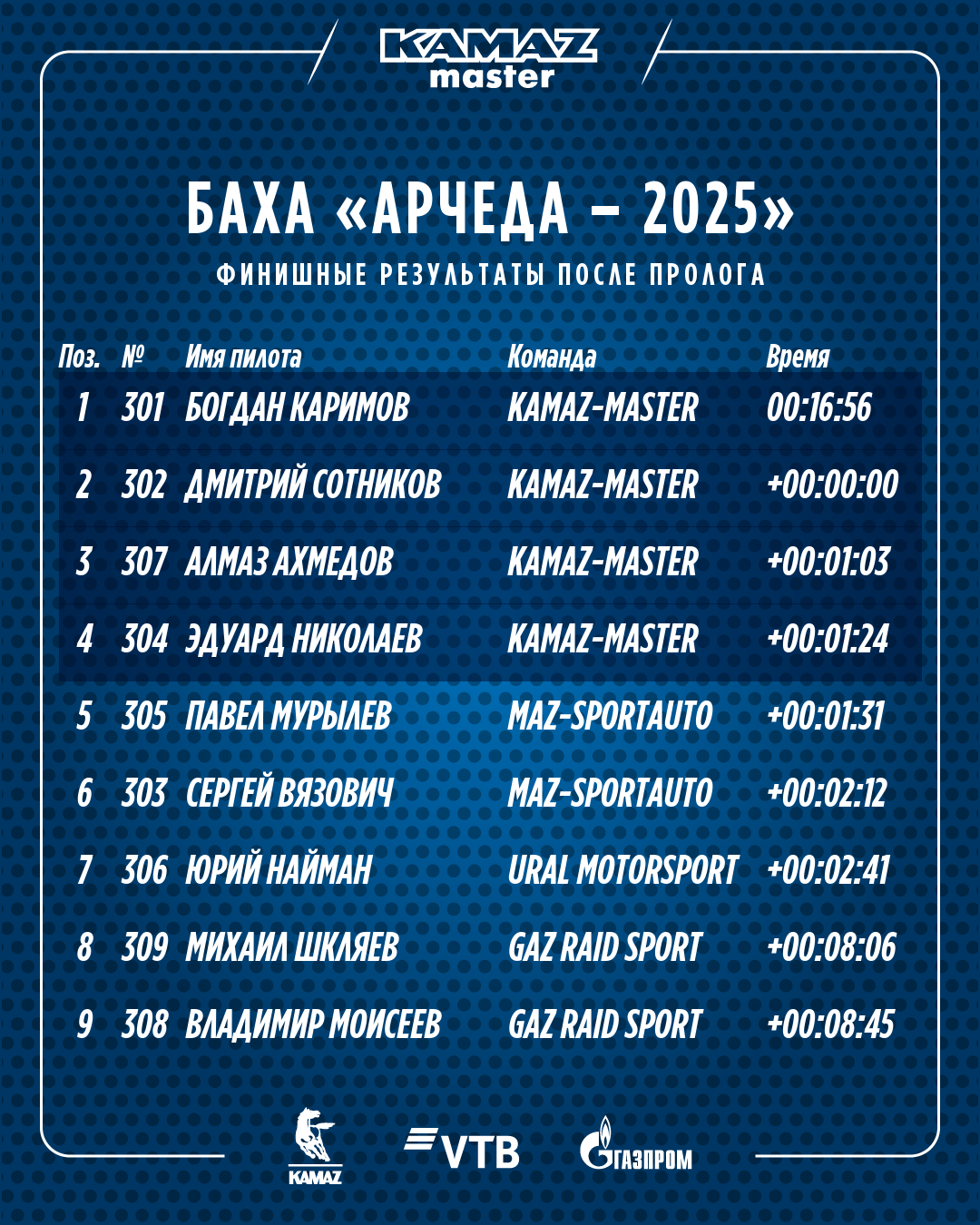Секунда в секунду с одинаковым временем завершили пролог экипажи Богдана Каримова и Дмитрия Сотникова. Целую минуту уступил им показавший третье время Борис Гадасин, выступающий в легковой категории. Ближайшие к камазовцам соперники грузового зачета из белорусской команды МАЗ-СПОРТавто Павел Мурылев и Сергей Вязович уступили лидерам соответственно 1 мин 31 сек и 2 мин 12 сек.