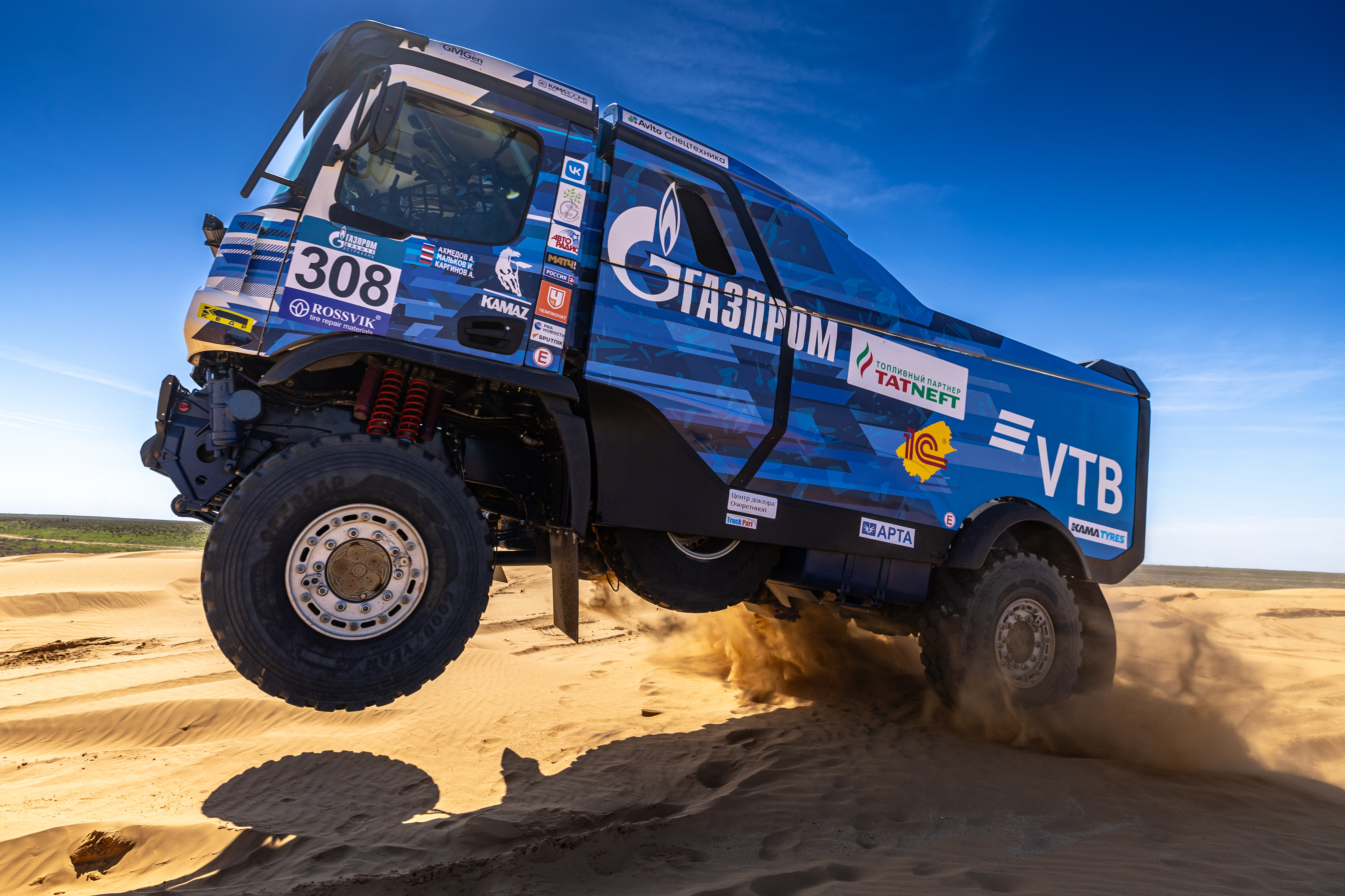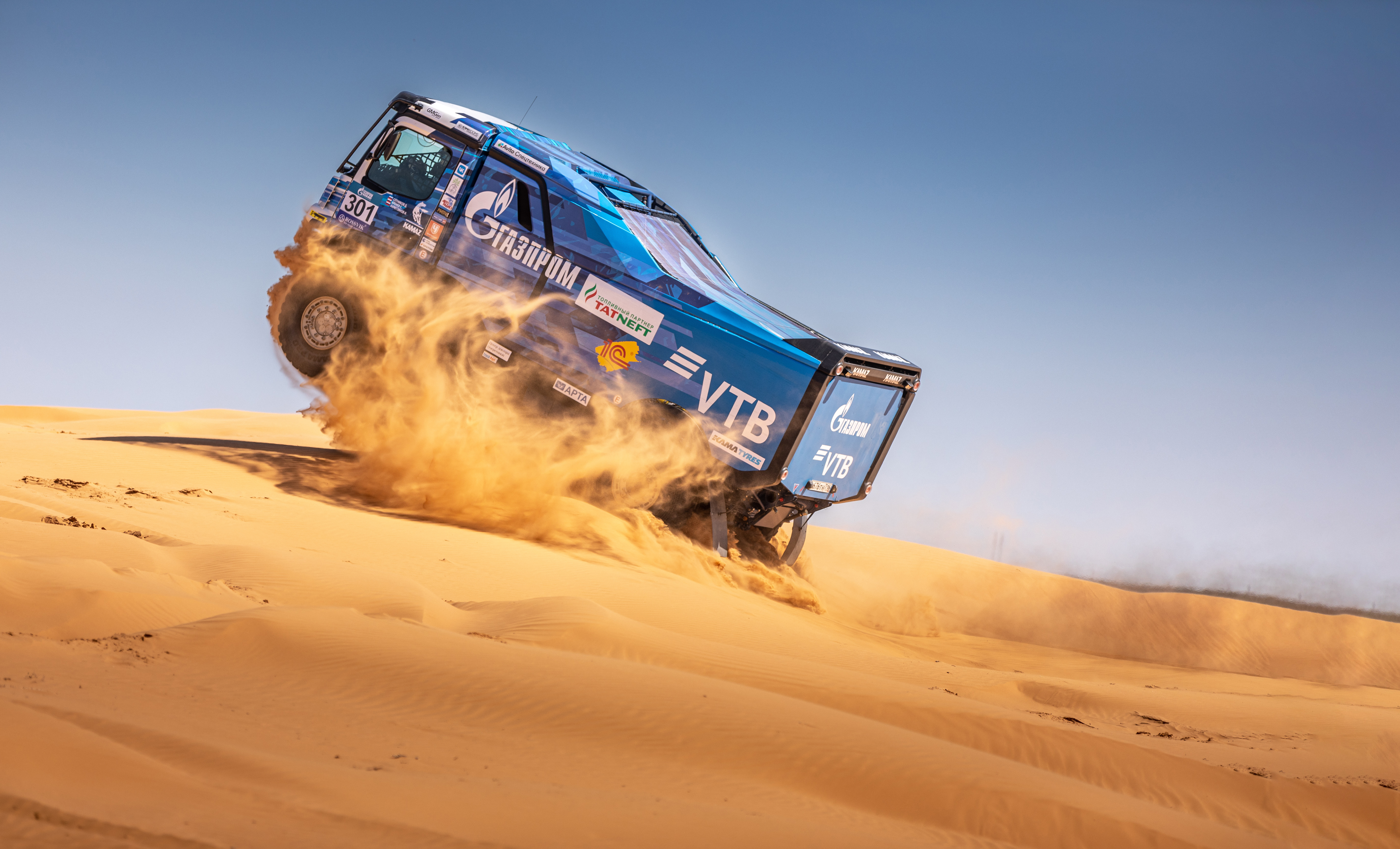 В гонке примет участие наш газодизельный грузовик, напомню, это совместный проект команды и ПАО «ГАЗПРОМ». Автомобиль оснащен газовым оборудованием СПГ(CNG) и четырьмя баллонами со сжатым газом общим объемом 360л. В смешанном цикле в среднем расходуется 30%газа и 70%дизельного топлива. За счет этого грузовик имеет увеличенный запас хода и сниженные выбросы сажи, CO2 и NOx. Пилотировать газовый КАМАЗ будет Сергей Куприянов.