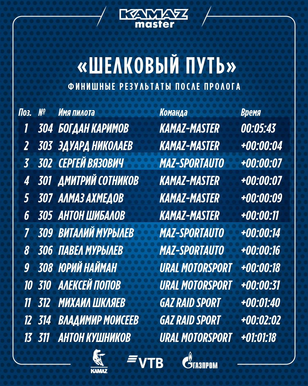 Таким образом, по итогам пролога лидерство в зачёте грузовиков захватил экипаж Каримова. Всего четыре секунды уступает ему руководитель команды Эдуард Николаев. По 7 секунд уступили лидеру экипажи Дмитрия Сотникова и Сергея Вязовича.