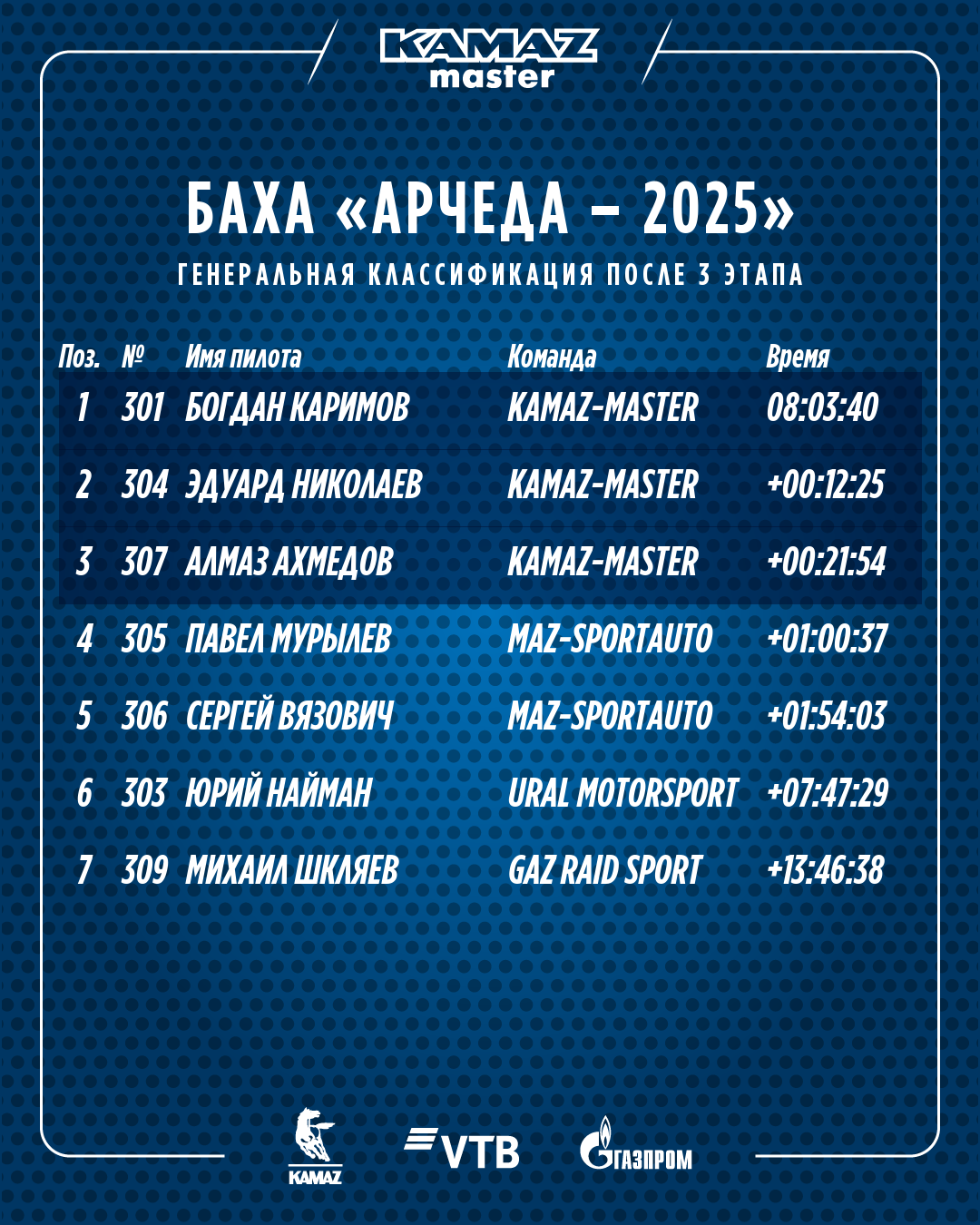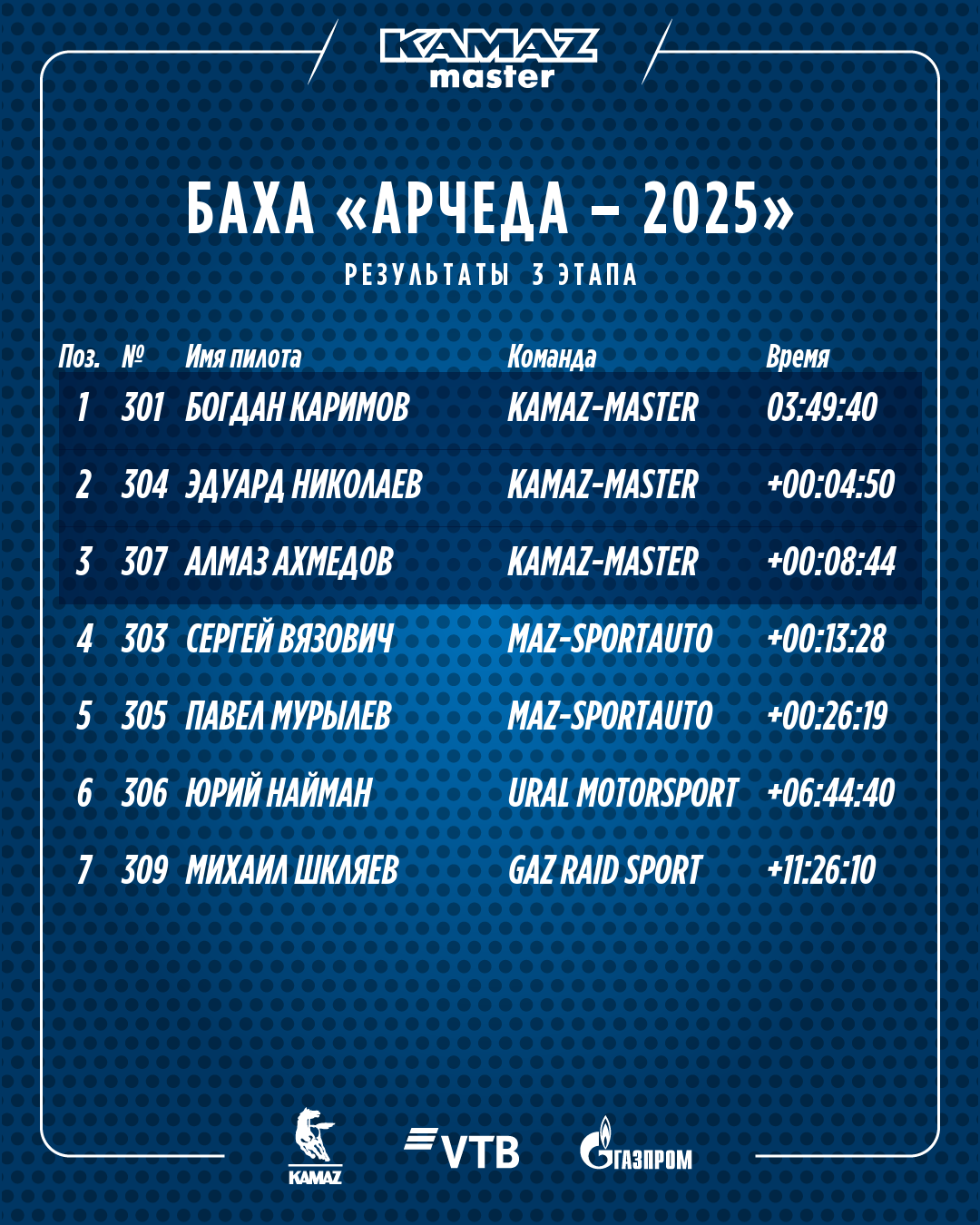 Трасса третьего дня Бахи «Арчеда» представляла собой два вчерашних круга с направлением движения в обратную сторону. Суммарная протяженность маршрута – почти 300 километров. С задачей надежно проехать сегодняшний спецучасток, «не расплескать» и «довезти» вчерашний успех до финиша гонки камазовские экипажи справились на отлично. Экипаж Богдана Каримова в итоге нарастил свое преимущество над соперниками и завоевал «золото» гонки. Второе место в гонке занял экипаж Эдуарда Николаева, «бронза» - у Алмаза Ахмедова.